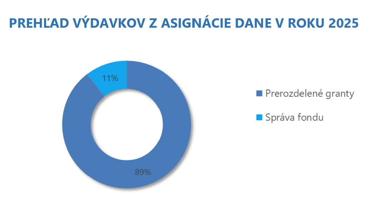 Celkovo sme finančné prostriedky z asignácie prerozdelili na granty s verejnoprospešným účelom v sume 780 542,19 € – tie predstavovali 89 % objemu použitých finančných prostriedkov. 11 % z celkovej prerozdelenej sumy nadačného fondu v sume 91 682,47 € bolo použitých na správu fondu (mzdy, komunikácia). V roku 2025 sme nepoužili finančné prostriedky na komunikáciu a propagáciu grantových programov.