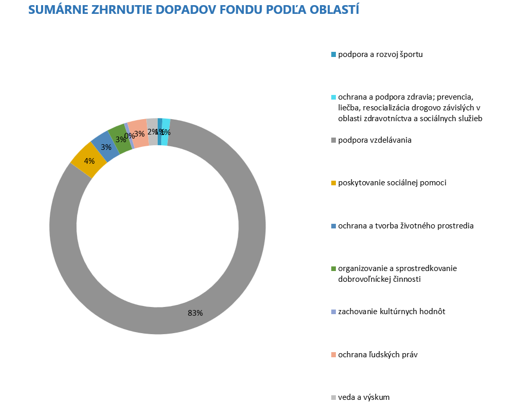 Celkovo sme finančné prostriedky z asignácie prerozdelili na granty s verejnoprospešným účelom v sume 771 471,52 € – tie predstavovali 90 % objemu použitých finančných prostriedkov. 10 % prostriedkov z asignácie 2022/23, v sume 82 947,09 € bolo použitých na správu fondu (mzdy, komunikácia). V roku 2023 sme nepoužili finančné prostriedky na propagáciu grantových programov.